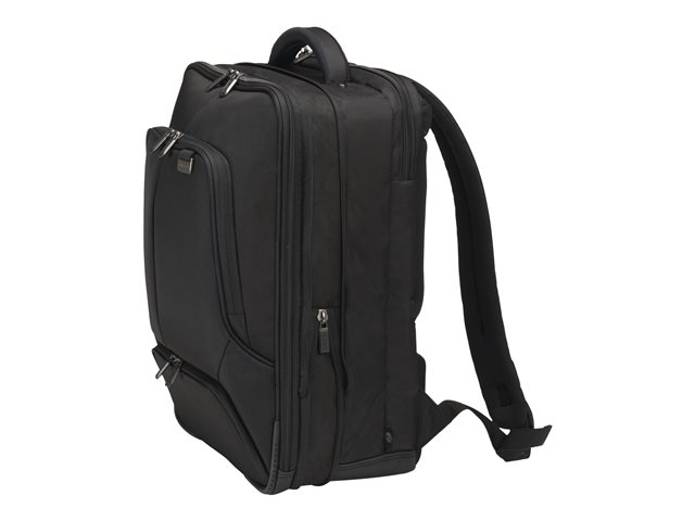 Avec l'Eco Backpack PRO, vous êtes un voyageur de " première classe ". Le sac à dos vous accompagne partout et correspond aux exigences élevées en termes de qualité, fonctionnalité et de protection. L'amour du détail de DICOTA fait de ce sac votre partenaire le plus fiable. La séparation du système fit-all dans le compartiment ordinateur recouvre votre ordinateur, le protège et s'adapte automatiquement aux tailles 12-14,1". La mousse légère en EVA perforée placée dans le compartiment verrouillable de l'ordinateur, protège parfaitement les angles de votre appareil. La tenue optimale pour votre ordinateur portable dans le compartiment est garantie par le revêtement antiglisse. Protection idéale pour votre tablette de taille 12,9"dans le compartiment formé en EVA avec doublure extra douce en Nylex. Espace de rangement généreux pour une imprimante, un projecteur et des documents dans le compartiment extensible. La poche frontale avec porte-clés et compartiments de rangement organise vos ustensiles personnels et offre de la place pour d'autres accessoires mobiles. Le rembourrage ergonomique du dossier, les sangles réglables en longueur, la poignée confortable et la lanière de fixation garantissent un confort de port optimal. La poche zippée cachée convient pour le passeport, le portefeuille, etc. Le fond de la sacoche est en matière étanche. Cela fait de l'Eco Backpack PRO le sac à dos parfait pour tous ceux qui se déplacent souvent et qui souhaitent soutenir la réutilisation raisonnable des bouteilles en PET grâce à une solution de transport écologique.