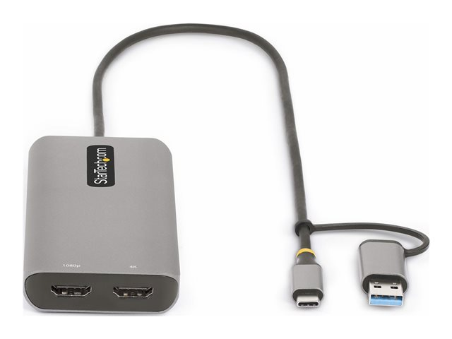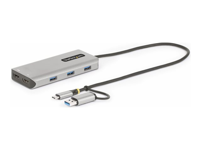 Cet adaptateur multiport USB Type-C et USB Type-A transforme presque n'importe quel ordinateur portable ou de bureau en une station de travail hautement productive prenant en charge deux écrans HDMI externes et disposant d'un hub USB à 3 ports. Le mini-dock est doté d'un câble hôte USB-C intégré de 1,3 pied (40 cm) et comprend un adaptateur USB-C vers USB-A attaché, ce qui lui permet de prendre en charge à la fois les ordinateurs hôtes USB-C et USB-A.
