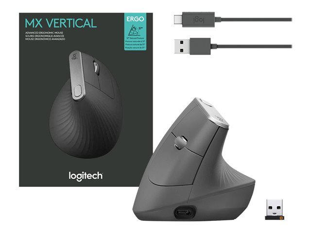 Souris verticale - ergonomique - optique - 6 boutons - sans fil, filaire - Bluetooth, 2.4 GHz - récepteur sans fil USB - graphite