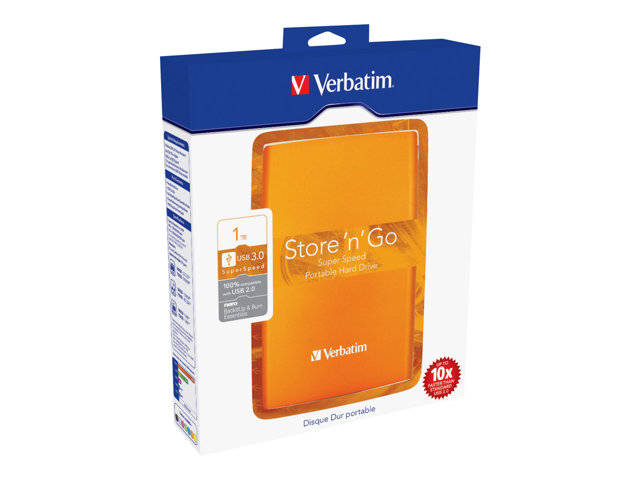 Le disque dur portable Verbatim Store 'n' Go est une solution de stockage hautes performances qui utilise une interface USB 3.0 haute vitesse. La norme USB 3.0 permet d'atteindre des débits multipliés par 10 par rapport à l'USB 2.0 (sur la base de mesure de la vitesse de bus USB), vous offrant un taux de transfert de données ultra-rapide.