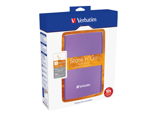 Le disque dur portable Verbatim Store 'n' Go est une solution de stockage hautes performances qui utilise une interface USB 3.0 haute vitesse. La norme USB 3.0 permet d'atteindre des débits multipliés par 10 par rapport à l'USB 2.0 (sur la base de mesure de la vitesse de bus USB), vous offrant un taux de transfert de données ultra-rapide.
