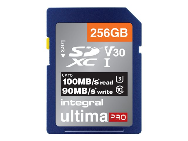 Description du produit Integral UltimaPro - carte mémoire flash - 256 Go - SDXC UHS-I Type du Produit Carte mémoire flash Format Carte mémoire SDXC UHS-I Capacité de stockage 256 Go Indice de vitesse Video Class V30 / UHS-I U3 / Class10 Garantie du fabricant Garantie de 5 ans -