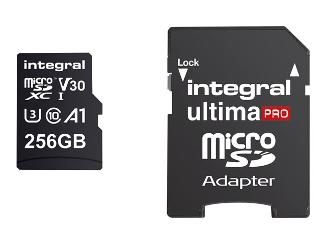 Description du produit Integral UltimaPro - carte mémoire flash - 256 Go - microSDXC UHS-I Type du Produit Carte mémoire flash Format Carte mémoire microSDXC UHS-I Capacité de stockage 256 Go Indice de vitesse A1 / Video Class V30 / UHS Class 3 / Class10 Couleur du boîtier Noir Adaptateur mémoire fourni Adaptateur microSDXC vers SD Garantie du fabricant Garantie de 5 ans -
