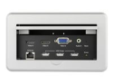 Cette boîte de connectivité pour table de conférence est discrète, intégrée à la table et vous permet de connecter un appareil VGA, Mini DisplayPort, HDMI ou vidéo composite à un écran ou un vidéoprojecteur HDMI. Lorsque le commutateur vidéo n'est pas en cours d'utilisation, vous pouvez simplement faire glisser l'élégant panneau protecteur sur les connecteurs pour les dissimuler à l'intérieur de la surface de la table ou du podium.