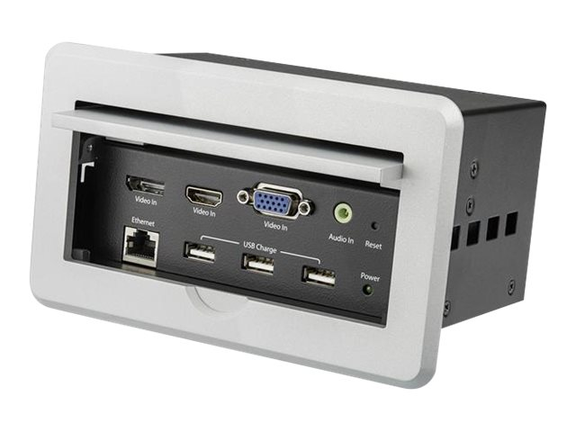 Ce boîtier de connectivitè pour table de confèrence pour installations A/V se pose sur votre table ou pupitre pour fournir une connectivitè A/V, de gestion de rèseau et de charge USB dans votre salle de confèrence, amphithèâtre ou salle de classe. Le boîtier facilite la connexion HDMI, DisplayPort et VGA des ordinateurs portables au grand ècran HDMI de votre salle, et fournit une connectivitè LAN et USB pour charger des pèriphèriques USB. Il permet ègalement une certaine gestion des câbles de salle de confèrence en dissimulant les câbles de connectivitè dans la table.