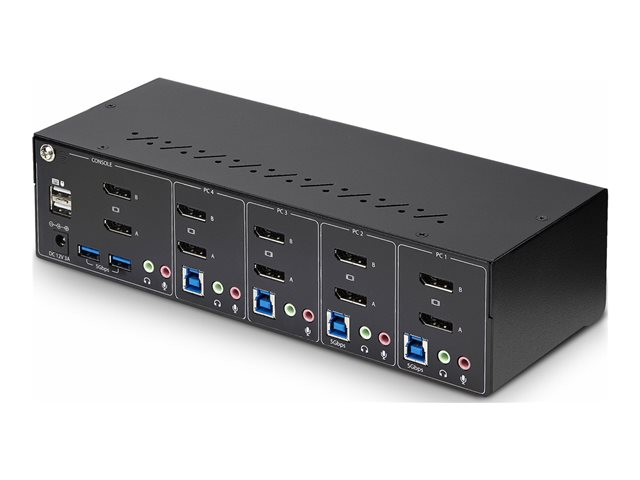 Ce commutateur KVM double moniteur permet aux utilisateurs de basculer entre quatre bureaux compatibles USB-A et DisplayPort. Il permet de partager deux moniteurs DisplayPort double 4K à 60 Hz, un clavier et une souris, ainsi que deux périphériques USB 5 Gbit/s.
